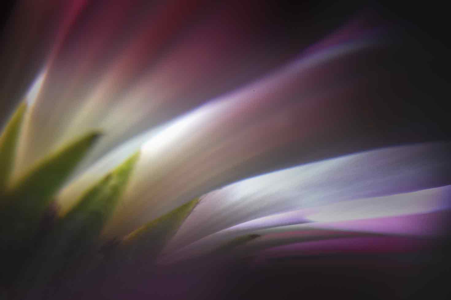 This ethereal photograph captures the essence of a flower in a dreamlike, abstract fashion. The composition focuses on the delicate petals, their forms blurred and elongated, creating a sense of fluid movement and graceful curves. The colours are soft and muted, blending seamlessly from pale pinks and purples to a luminous white centre, evoking a sense of serenity and tranquillity.