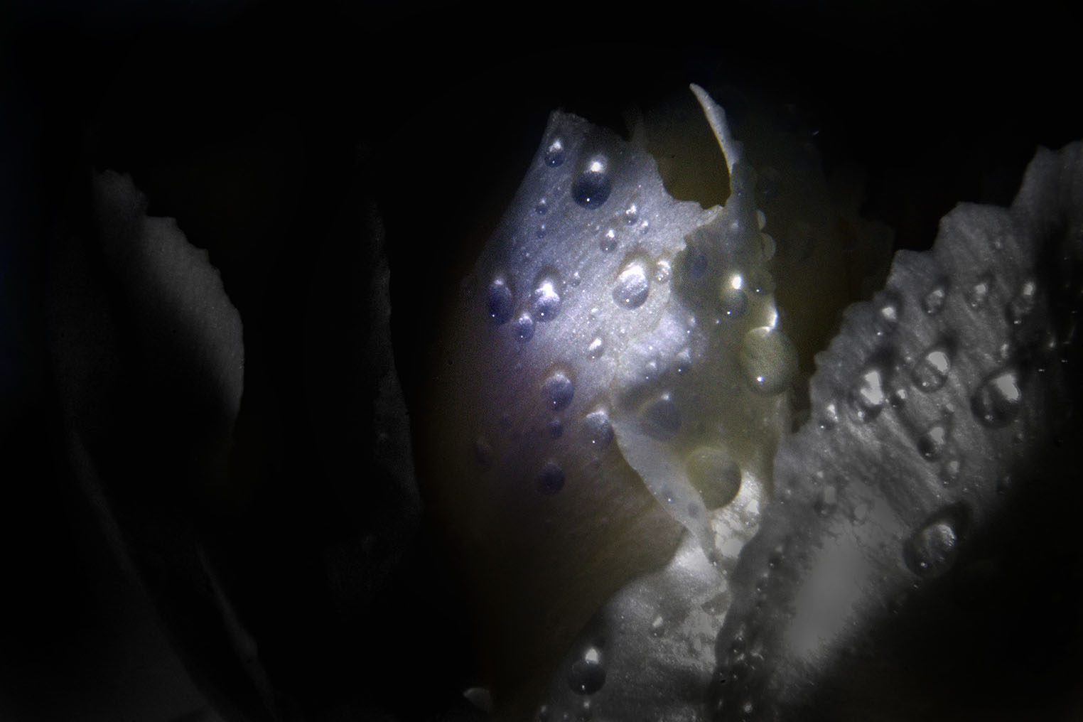 An exquisite synthesis of elegance and mystique. A central figure, perhaps a floral element, is bathed in light against a dark, undefined background. The droplets adorning it sparkle like diamonds, each one capturing and bending the light to reveal the intricate textures and contours. Artistic value here lies in the piece’s powerful symbolism of unity and the bond between the natural world and its inherent beauty. The image speaks to the onlooker of connections that are as transient as they are eternal, offering a meditation on the delicate interplay between strength and fragility.