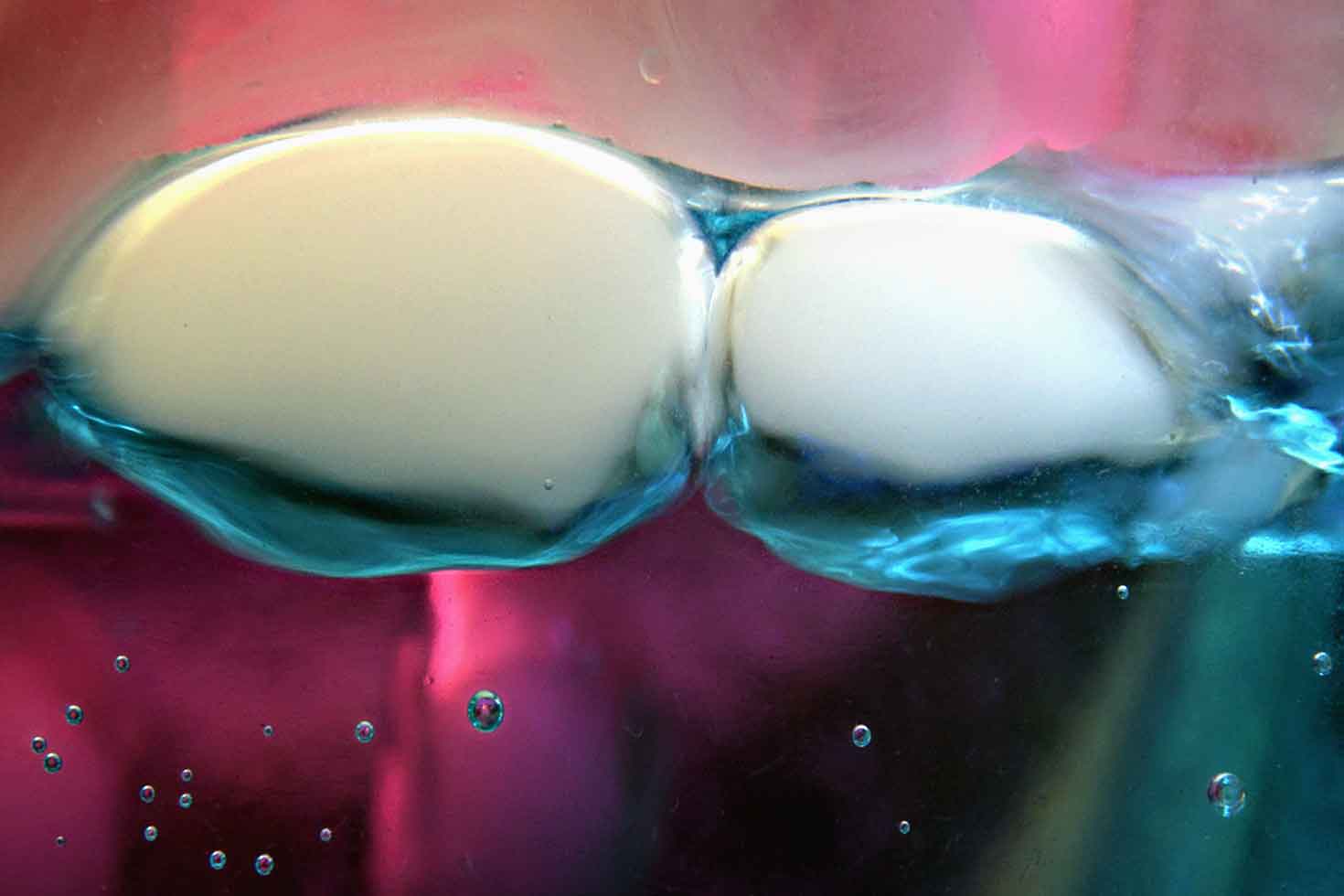 Capturing an almost alien encounter, two large bubbles press against each other, their surfaces a dance of light and colour. The image is vibrant and lively, with a sense of tension and connection between the bubbles. The surrounding water drops add texture and a sense of scale, creating a microcosmic landscape.
