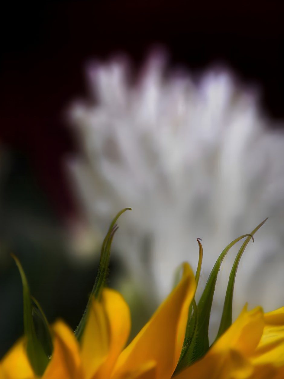 The blurred background, featuring a soft white flower and deep shadows, provides a striking contrast to the sharpness of the foreground. This depth of field not only highlights the intricate details of the sunflower but also creates a sense of mystery and intrigue. The viewer is left to imagine the full context of the scene, adding a layer of narrative to the image.